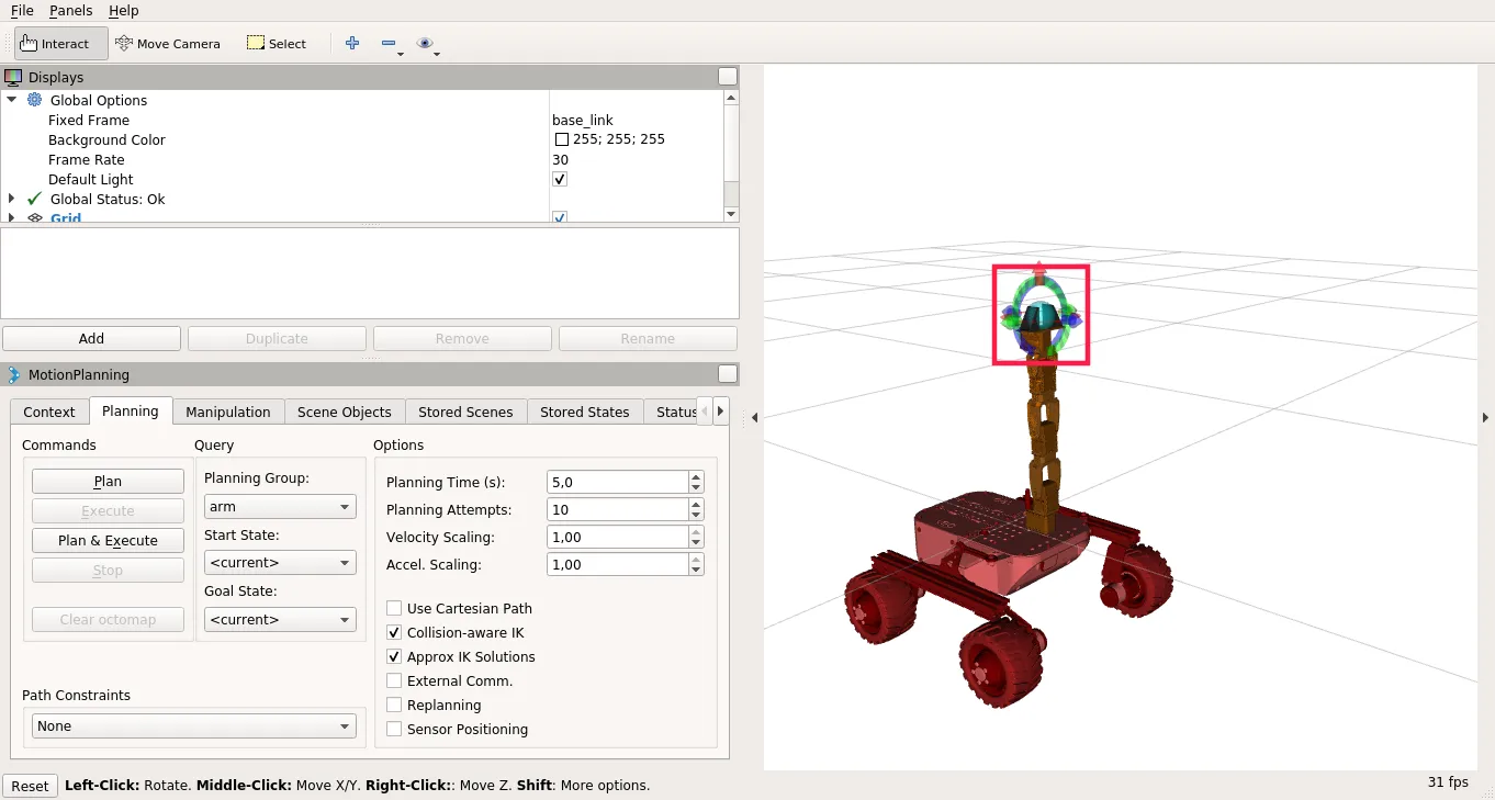 - Click on Planning tab in Motion Planning display and check Approx IK Solutions,