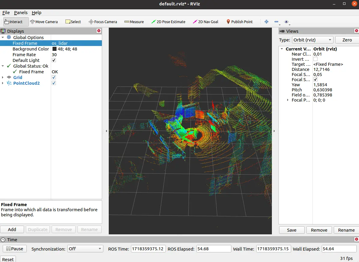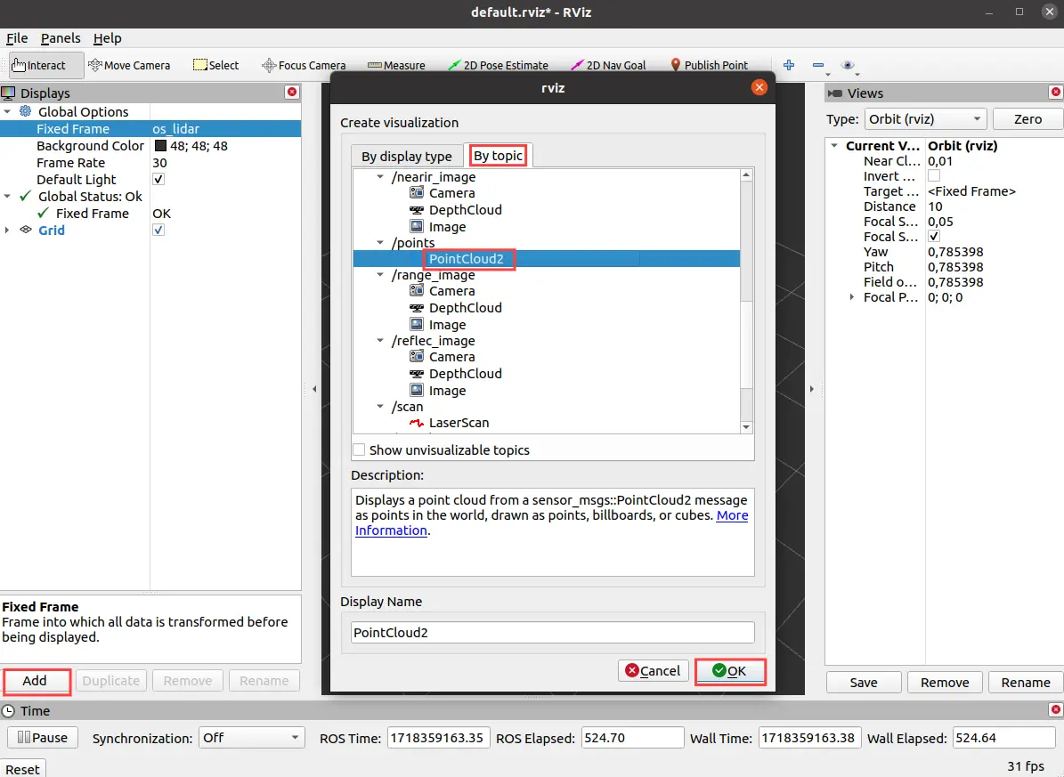 /ouster/points topic. Choose the PointCloud2 display and click Ok.