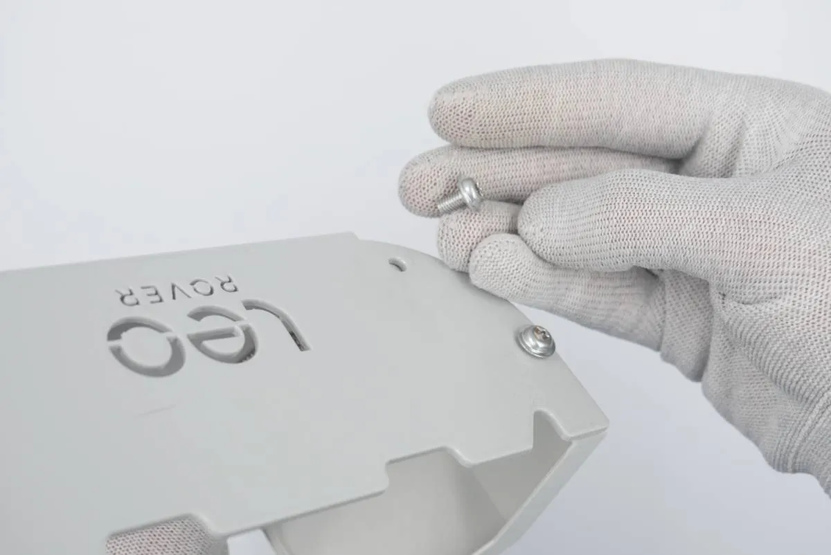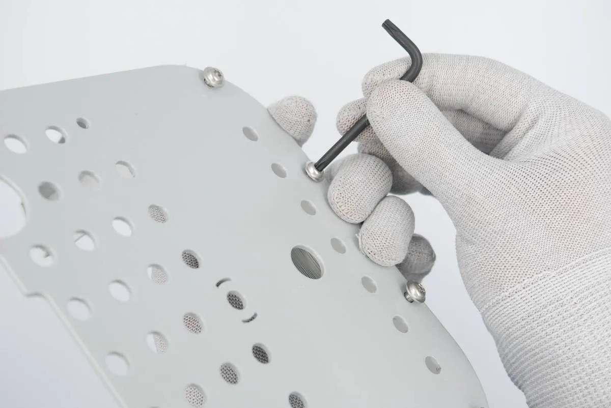 Align the mounting plate with the front cover and insert and pre-tighten M4x10 torx screws, one in each of the corresponding holes in the plate front.